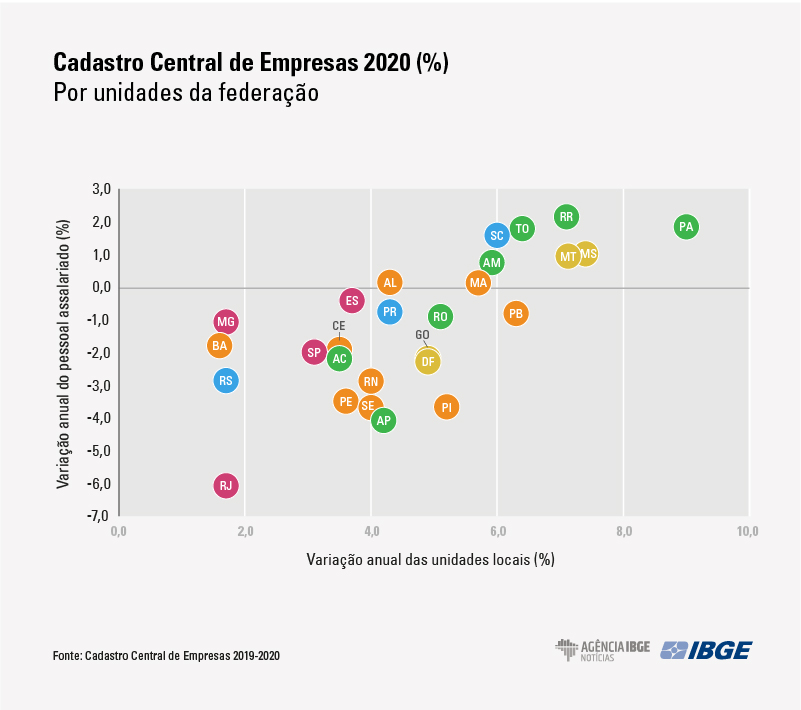 Em relação a 2019, houve aumento no número de unidades locais e queda do total de salários e outras remunerações em todas as grandes regiões. O crescimento foi mais expressivo no Norte, onde o número de unidades locais aumentou 6,9% e no Centro-Oeste (5,8%). O Norte também foi a única região a registrar crescimento em relação ao pessoal ocupado assalariado (0,8%). A maior queda nesse contingente foi do Sudeste (-2,4%), com destaque para São Paulo, que perdeu 262,7 mil assalariados, e Rio de Janeiro, com perda de 238,7 mil.