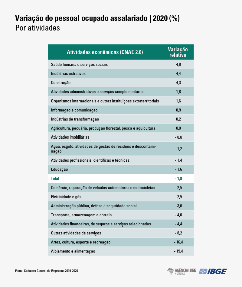 A atividade econômica Artes, cultura, esporte e recreação também teve uma retração de dois dígitos: em um ano, perdeu 16,4% de seu pessoal ocupado assalariado. O recuo também foi recorde na série histórica. Entre as empresas desse grupo estão, por exemplo, cinemas, teatros e casas de organização de festas, que foram bastante impactados pelos efeitos da pandemia.