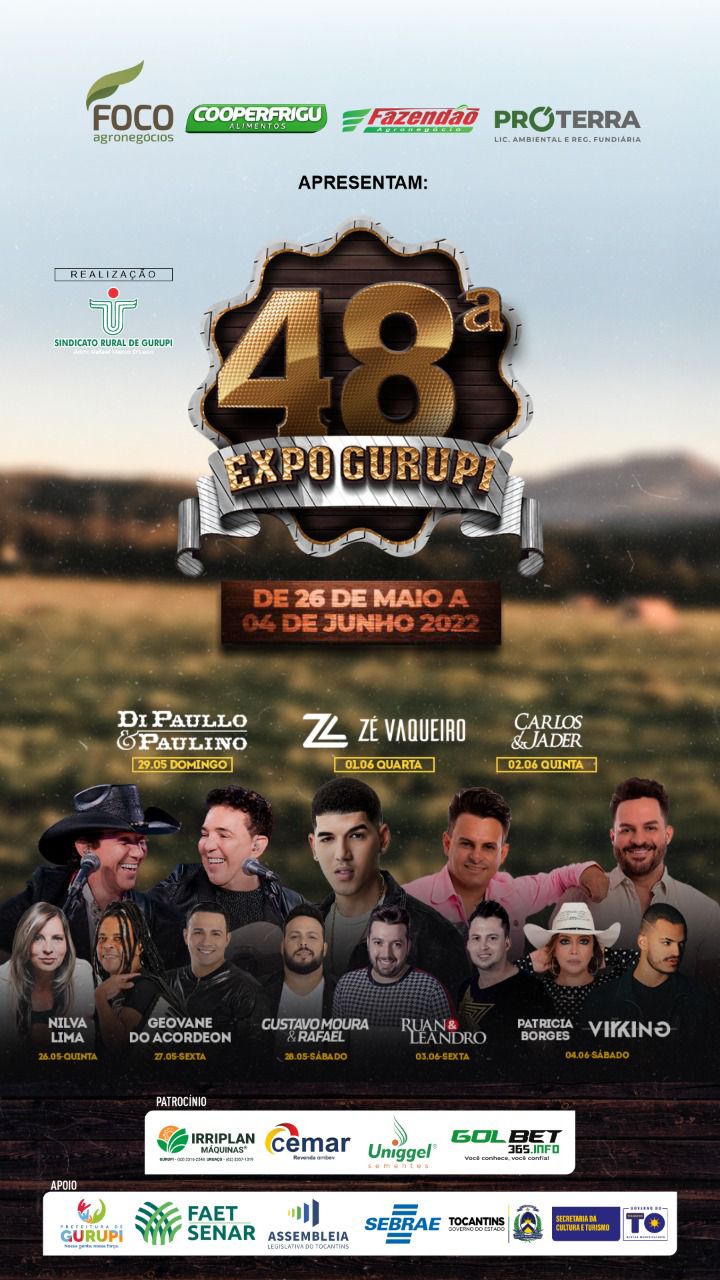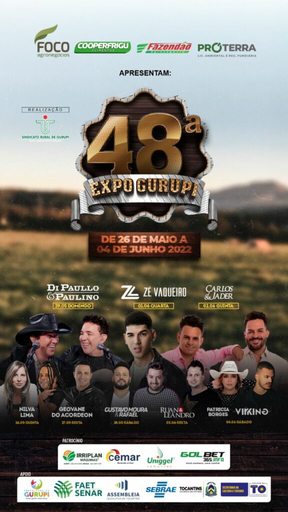 A arena do parque de exposições de Gurupi será palco para grandes artistas nacionais como Zé Vaqueiro na próxima quarta-feira, data da abertura oficial, único dia em que será exigido um 1k de alimento não perecível para ter acesso ao evento. Na programação também constam shows com Di Paullo & Paulino (28/05), Carlos e Jader (02/06) entre outros. E neste sábado, dia 28/05 tem a Cavalgada com premiação para as melhores comitivas.