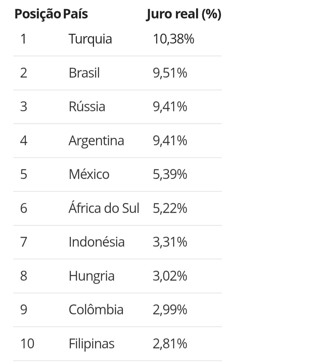 O Comitê de Política Monetária (Copom) do Banco Central reduziu a taxa básica de juros nesta quarta-feira (18). Apesar do recuo, o Brasil permanece na segunda posição global de juros reais — índice que desconta a inflação projetada. Com uma taxa de 9,51%, o país fica atrás apenas da Turquia, que lidera o levantamento mundial com 10,38%, conforme dados do Ranking Mundial de Juros Reais.