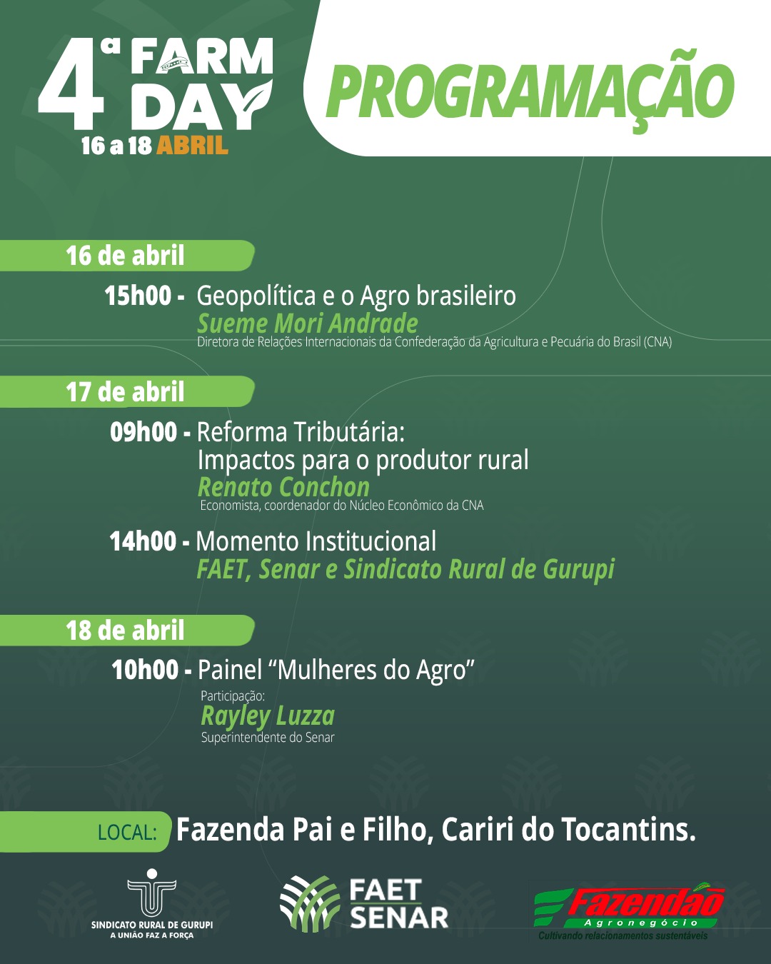 O 4º Farm Day Fazendão, realizado de 16 a 18 de abril na Fazenda Pai e Filho, em Cariri do Tocantins, reúne produtores rurais, especialistas e empresas para debater temas estratégicos do agronegócio. Com palestras nacionais e painéis temáticos, o evento promove conhecimento técnico e networking em um cenário de desafios globais e reformas nacionais.