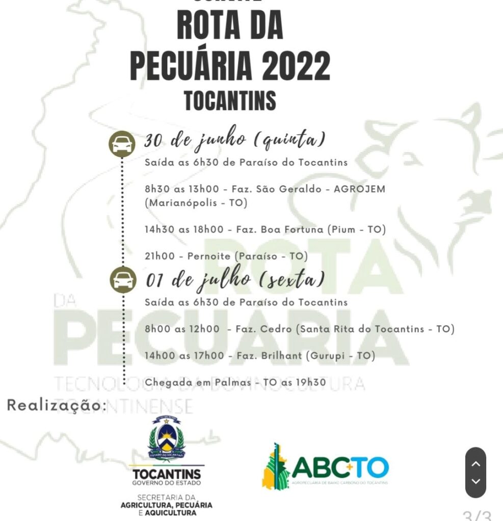 A Rota da Pecuária 2022 iniciou no dia 27 de junho na Fazenda Nova em Pedro Afonso, no dia 28 esteve na Fazenda Araguaiana em Buriti, nesta quarta-feira, 29, na Fazenda Aviação em Araguanã-TO, nesta quinta-feira, 30, estará nas Fazendas São Geraldo – AGROJEM em Marianópolis – TO e Boa Fortuna em Pium – TO e na sexta-feira, 30, nas Fazendas Cedro em Santa Rita do Tocantins – TO e das 14h00 as 17h00 concluirá a programação na Fazenda Brilhant em Gurupi – TO.
