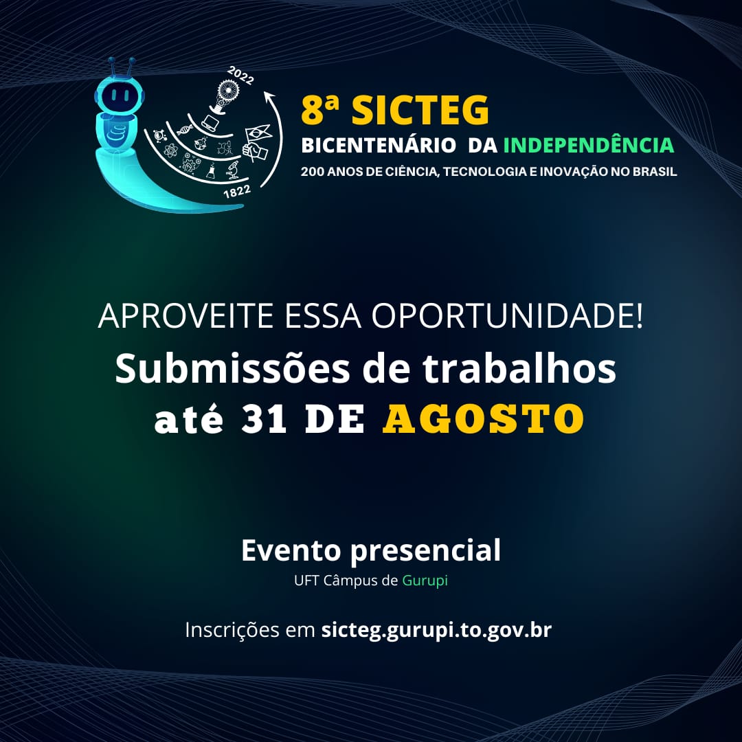 Uma das ações do evento é a submissão gratuita de trabalhos científicos e os interessados em apresentar os trabalhos no evento podem inscrevê-los até o dia 31 de agosto de 2022. As submissões ocorrerão exclusivamente por meio do envio e preenchimento dos formulários disponível na plataforma: www.sicteg.gurupi.to.gov.br/ .