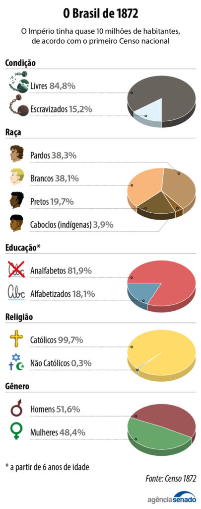 O Censo de 1872 encontrou no país quase 10 milhões de “almas” (mais precisamente, 9.930.478). Hoje, como comparação, só a cidade de São Paulo tem 12,4 milhões de habitantes e o Brasil todo conta 215 milhões.