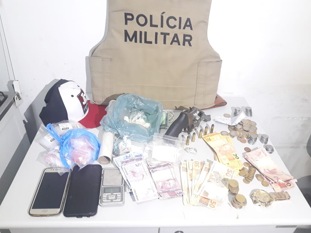 Com os autores os policiais localizaram dois aparelhos celulares, R$ 1.339,00 reais em dinheiro, um revólver calibre 38 e seis munições de mesmo calibre, aproximadamente 350g de substâncias entorpecentes análogas ao crack, cocaína e maconha, além de uma balança de precisão e materiais utilizados para embalagem de droga.