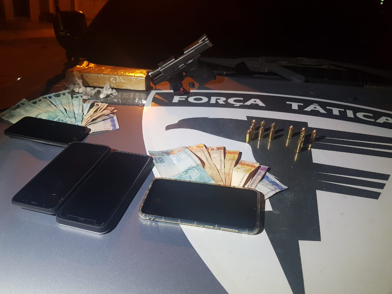 Na noite desta quinta-feira, 26, o 4º Batalhão de Polícia Militar (4º BPM) prendeu três homens, 20, 23 e 25 anos, acusados de tráfico de drogas e porte ilegal de arma de fogo em Gurupi. Cerca de 480g de produto entorpecente análogo à maconha, seis aparelhos celulares, R$ 1.337,00 reais, um veículo Gol, cor prata, uma pistola calibre 380, um carregador e 13 munições de mesmo calibre foram encontradas em poder dos acusados.