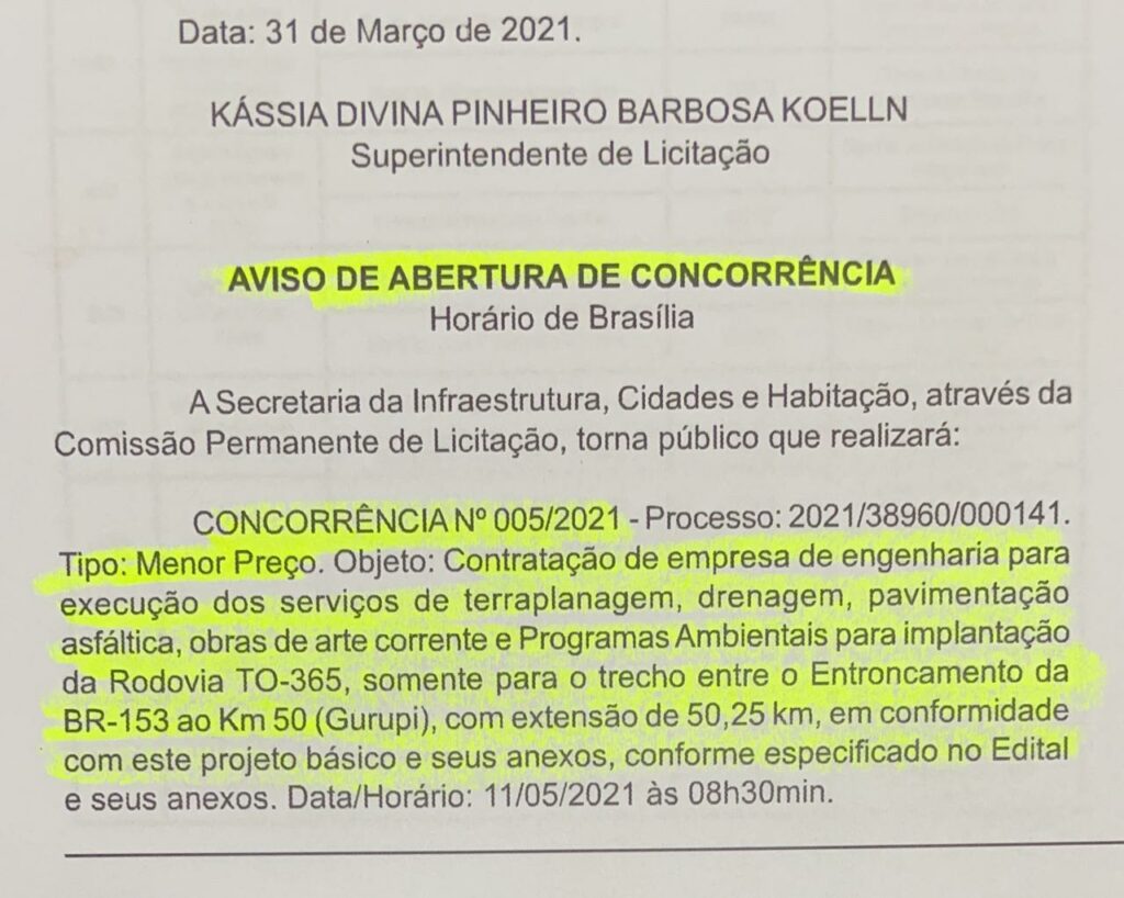 Informações disponíveis no Edital de Abertura da Concorrência Pública para contratação da empresa aponta que dia 11 de maio de 2021 deverá ser anunciado o nome da empresa que dará sequência a pavimentação da rodovia TO-365, que liga Gurupi ao Trevo da Praia.