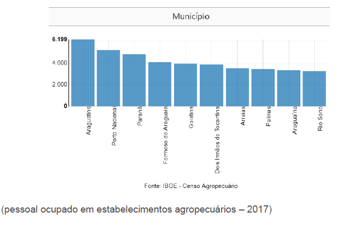 O campo mostra músculos na economia local. Essas mais de 204 mil pessoas ocupadas em atividades dos estabelecimentos representam 32% de toda a mão de obra ocupada do Estado, que por sua vez alcançou o número do 640 mil, conforme levantamentos do próprio instituto. Os municípios de Araguatins, Porto Nacional e Paranã, despontam na geração de postos de trabalho no setor, gerando respectivamente 6.199; 5.212 e 4808 oportunidades.
