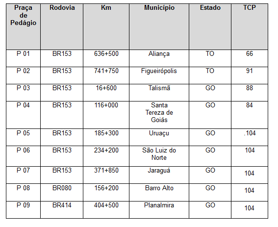 CONCESSÃO – De acordo com as minutas de edital e contrato, a concessão consiste na exploração por 30 anos da infraestrutura e da prestação do serviço público de recuperação, conservação, manutenção, operação, implantação de melhorias e ampliação de capacidade das rodovias BR-153/414/080/TO/GO, no trecho da BR-153/TO/GO de 624,1 km, entre o entroncamento com a TO-070 (Aliança do Tocantins) até o entroncamento com a BR-060 (Anápolis); no trecho da BR-414/GO de 139,6 km, entre o entroncamento com a BR-080/GO-230(A)/324 (Assunção de Goiás) até o entroncamento com a BR-153/GO-222/330 (Anápolis); no trecho da BR-080/GO de 87 km, entre o entroncamento com a BR-414/GO-230(B) (Assunção de Goiás) até o entroncamento com a BR-153(A)/GO-342(B).