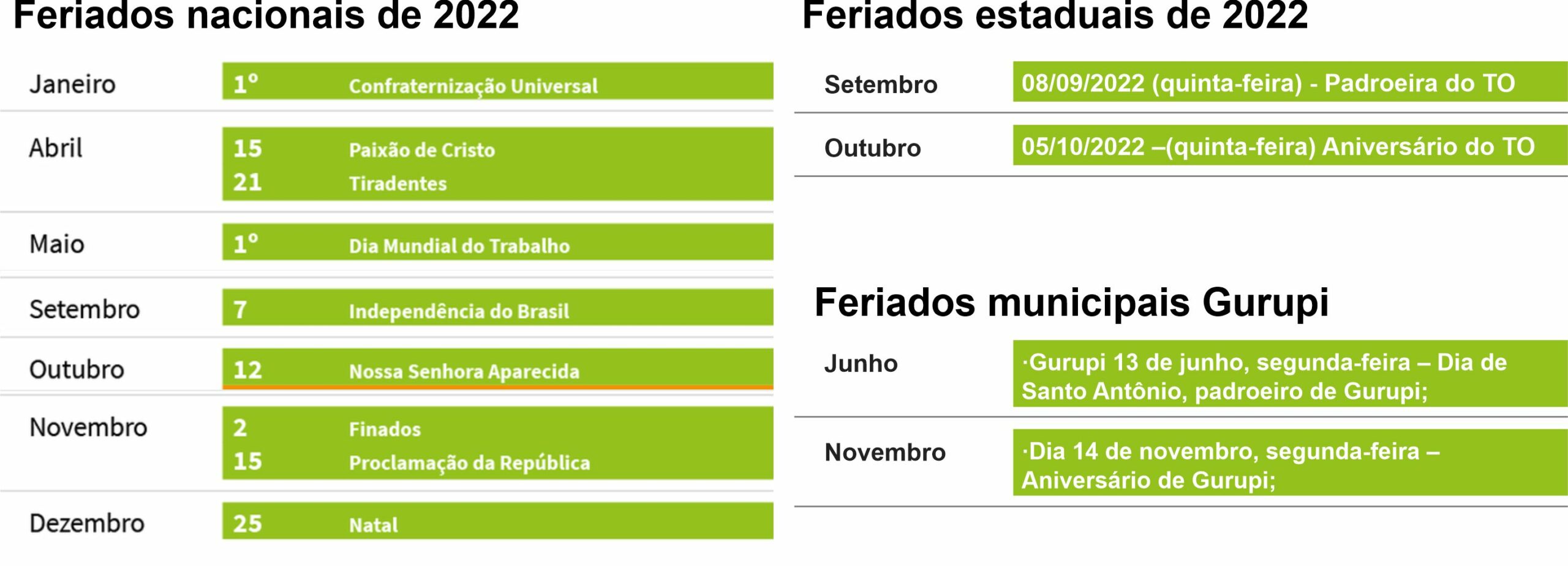 Lar»Notícias»Destaques»Ano de 2022 terá apenas um feriado nacional prolongado e em Gurupi haverão três