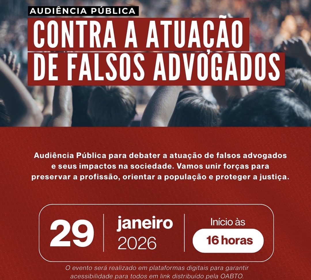 A Ordem dos Advogados do Brasil – Seccional Tocantins (OABTO) realizará, no dia 29 de janeiro, às 16h, audiência pública para discutir o combate ao exercício ilegal da advocacia e às fraudes cibernéticas que utilizam indevidamente a identidade de profissionais do Direito e os sistemas processuais eletrônicos. O encontro será on-line, por meio de plataforma digital, com link de acesso a ser divulgado pela Seccional, garantindo a participação da advocacia e da sociedade.