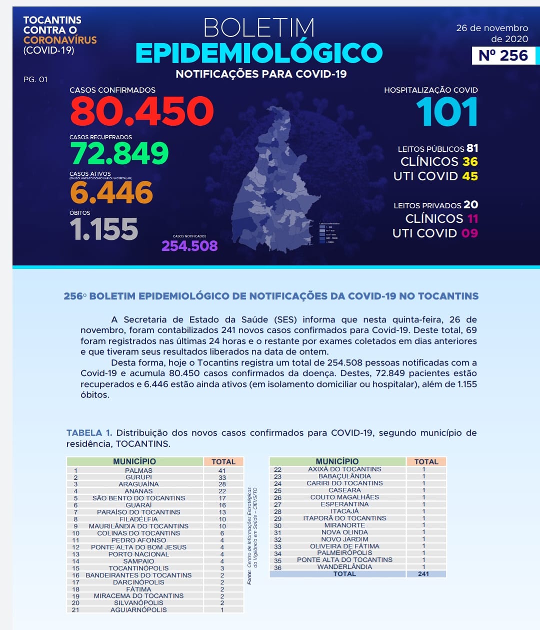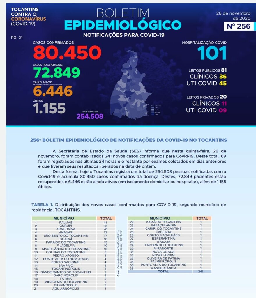 Conforme o Boletim Epidemiológico da Covid-19 desta quinta-feira, 26, entre os 241 novos casos, 102 concentram nas três maiores cidades do Tocantins, sendo 41 em Palmas, 33 em Gurupi e 28 em Araguaína.