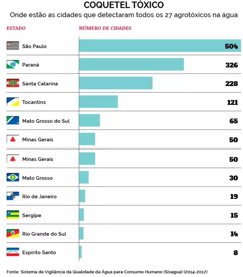 Dados do Ministério da Saúde obtidos e tratados em investigação conjunta da Repórter Brasil, Agência Pública e a organização suíça Public Eye mostram que o Tocantins aparece na quarta posição no ranking nacional com 121 cidades detectadas 27 agrotóxicos na água. Araguaína foi encontrado Glifosato acima do limite considerado seguro no Brasil, Enquanto Gurupi foram detectado três agrotóxicos e Paraíso do Tocantins foram detectados 11 acima do limite. “A informação é alarmante e merece toda a atenção”, alerta a doutora em química analítica e Mestre em química da UFT, Grasiele Soares Cavallini, do Campus da UFT de Gurupi.