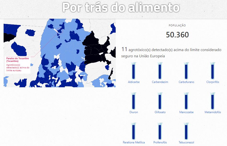 Entre os locais com contaminação múltipla estão Araguaína onde foi encontrado Glifosato acima do limite considerado seguro no Brasil. Gurupi foram detectado três agrotóxicos acima do limite considerado seguro, sendo eles Endossulfan (Extremamente Tóxico e proibido no Brasil e na União Europeia), Endrin (Extremamente Tóxico) e Tebuconazol (Pouco Tóxico). Já Paraíso do Tocantins os números são ainda mais alarmantes e foram detectados 11 agrotóxicos acima do limite considerado seguro na União Europeia, sendo eles Aldicarbe, Carbendazim, Carbofurano, Clorpirifós, Diuron, Glifosato, Mancozebe, Metamidofós, Parationa Metílica, Profenofós e Tebuconazol.