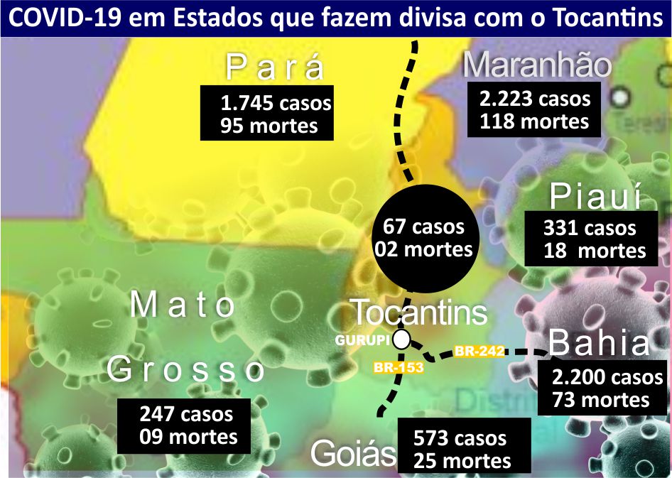 Desta forma, o Tocantins agora contabiliza 67 casos confirmados da Covid-19, nas cidades de Palmas (33), Araguaína (24), Cariri do Tocantins (01), Couto Magalhães (01), Guaraí (03), Gurupi (01), Dianópolis (01), Paraíso do Tocantins (01), Sítio Novo (01) e Tocantinópolis (01).