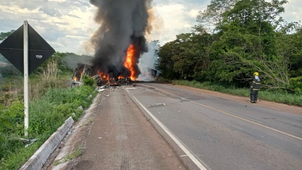 “Colisão entre duas carretas. Uma carregada com diesel s10, que pegou fogo e os bombeiros militares estão em ação para resfriamento e combate às chamas. Vítimas foram conduzidos por terceiros a hospital de Paraíso”, informou o Corpo de Bombeiros.