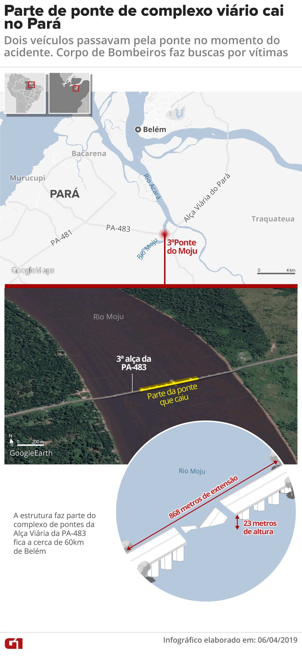 “Com o incidente, foi rompida parte da estrutura, que possui cerca de 900 metros de extensão e 23 vãos. De acordo com informações da PRE, cerca de 50 metros da ponte, localizada no quilômetro 48 da rodovia PA-483, foram destruídos com esse acidente”.