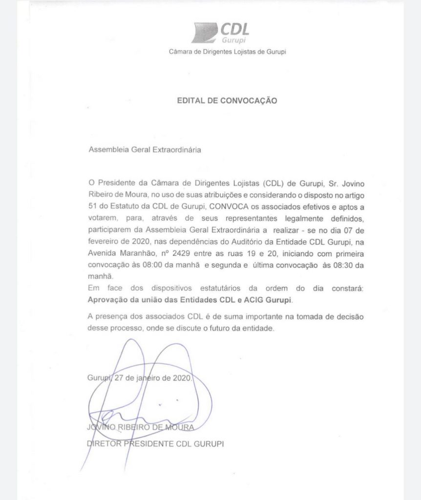 O presidente da Câmara de Dirigentes Lojistas de Gurupi (CDL), Jovino Ribeiro Moura, publicou nesta segunda-feira, 27, Edital de Convocação de Assembleia Geral Extraordinária que será realizada às 08h do dia 07 de fevereiro de 2020 para aprovação da união da entidade com a Associação Comercial e Industrial de Gurupi (ACIG).