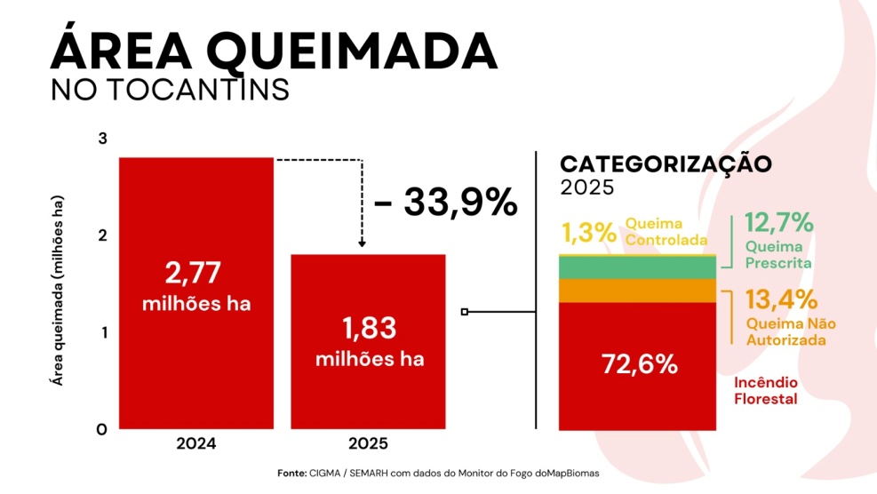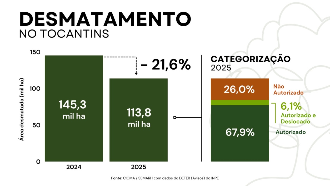 O Tocantins registrou em 2025 redução simultânea no desmatamento e na área queimada em relação a 2024, segundo dados do Centro de Informações Geográficas em Gestão do Meio Ambiente (CIGMA). As informações são baseadas em levantamentos do MapBiomas e do Sistema de Detecção de Desmatamento em Tempo Real (Deter), do Instituto Nacional de Pesquisas Espaciais (Inpe).