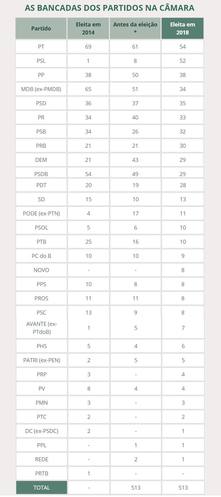 Por outro lado, o PSL – partido do presidente da República, Jair Bolsonaro – saiu de 1 deputado eleito em 2014 para 52 deputados em 2018. O estreante Partido Novo, que não tinha representantes eleitos, conquistou 8 vagas no último pleito.