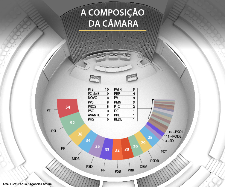 O reinício dos trabalhos legislativos na Câmara dos Deputados será marcado por um novo balizamento de forças entre os 30 partidos com representantes eleitos para esta legislatura (2019-2023).