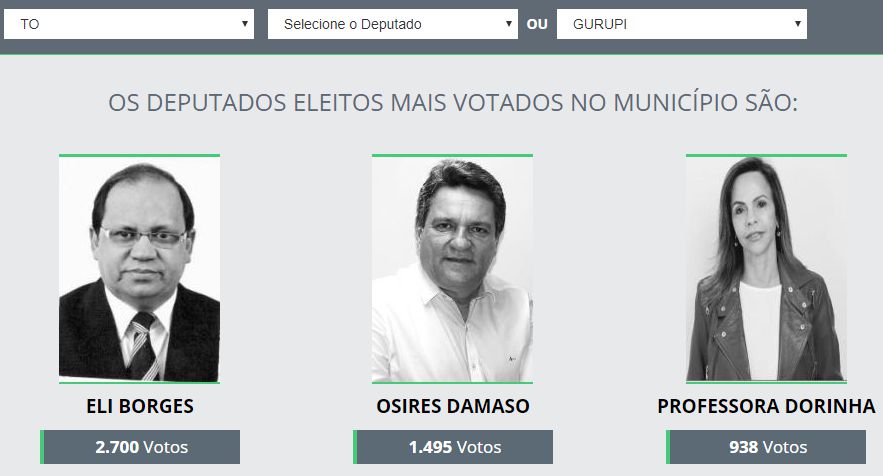 Caso for considerado a representatividade o deputado Eli Borges foi o mais votado entre os eleitos em Gurupi com 2.700 votos, seguido por Osires Damaso que teve 1.495 votos dos gurupienses e professora Dorinha recebeu 938 votos. No contexto estadual, Tiago Dimas foi quem recebeu mais votos da sua cidade Araguaína e teve 27.562 votos, enquanto em Palmas o federal eleito mais bem votado foi Eli Borges com 16.554 votos, Paraíso do Tocantins ajudou eleger Osires Damaso com 8.462 votos, enquanto em Porto Nacional deu a Vicentinho Jr. 5.090.