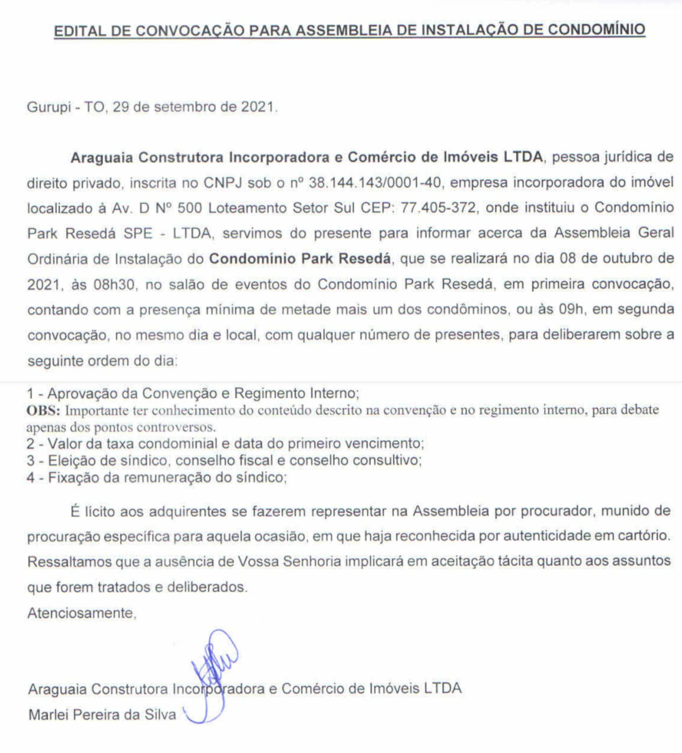 Construtora Araguaia publica Edital de Convocação para Assembleia de Instalação do Condomínio Resedá