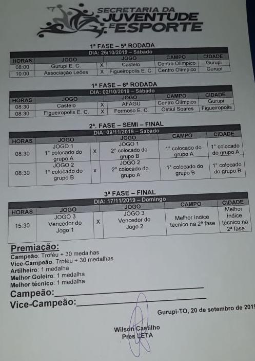 A rodada de estréia acontece domingo (29) com dois jogos no Centro Olímpico Ediberto Moreira Aguiar em Gurupi. O Gurupi enfrenta a AFAGU às 14h15 pelo grupo A, enquanto que no grupo B Associação Leões recebe o Formoso às 16h15. Na primeira rodada Castelo (Grupo A) e Figueirópolis (Grupo B) folgam.