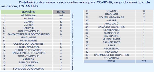 Confira a distribuição dos casos confirmados acumulados da COVID-19, segundo município de residência, TOCANTINS.