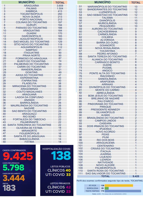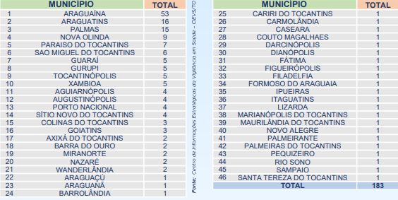 O boletim aponta que duas pessoas foram a óbito, sendo elas um homem de 95 anos residente em Araguaína, e uma mulher de 65 anos residente em Tocantinópolis.
