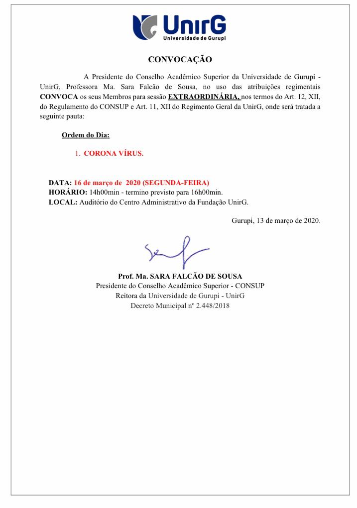 Além da convocação, a Universidade publicou uma nota informando que instituição está atenta à situação de pandemia do novo Coronavírus (COVID-19) e toma medidas de proteção, segurança e saúde de toda a sua comunidade acadêmica, mas entendeu que “até o momento não há necessidade de suspensão das aulas”.
