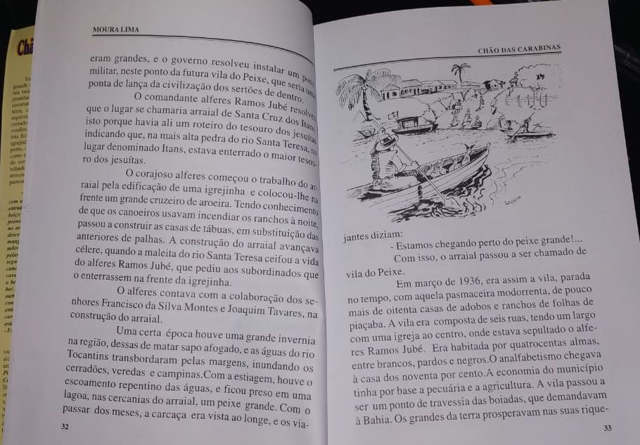 “A Vila de Peixe só vai pra frente quando se libertar dos coronéis e do carrancismo excomungado, o seu progresso virá da força das águas do Rio Tocantins”. Fragmentos de uma realidade retratada e vivenciada em 1936 pelo velho pescador João Tataruna no romance Chão da Carabinas, do escritor Moura Lima (2002).
