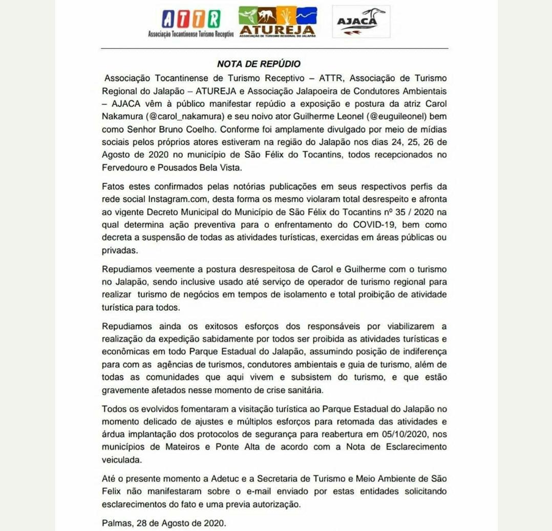 “Repudiamos veemente a postura desrespeitosa de Carol e Guilherme com o turismo no Jalapão, sendo inclusive usado até serviço de operador de turismo regional para realizar turismo de negócios em tempos de isolamento e total proibição de atividade turística para todos”, diz a nota assinada pela Associação Tocantinense de Turismo Receptivo – ATTR, Associação de Turismo Regional do Jalapão – ATUREJA e Associação Jalapoeira de Condutores Ambientais – AJACA.