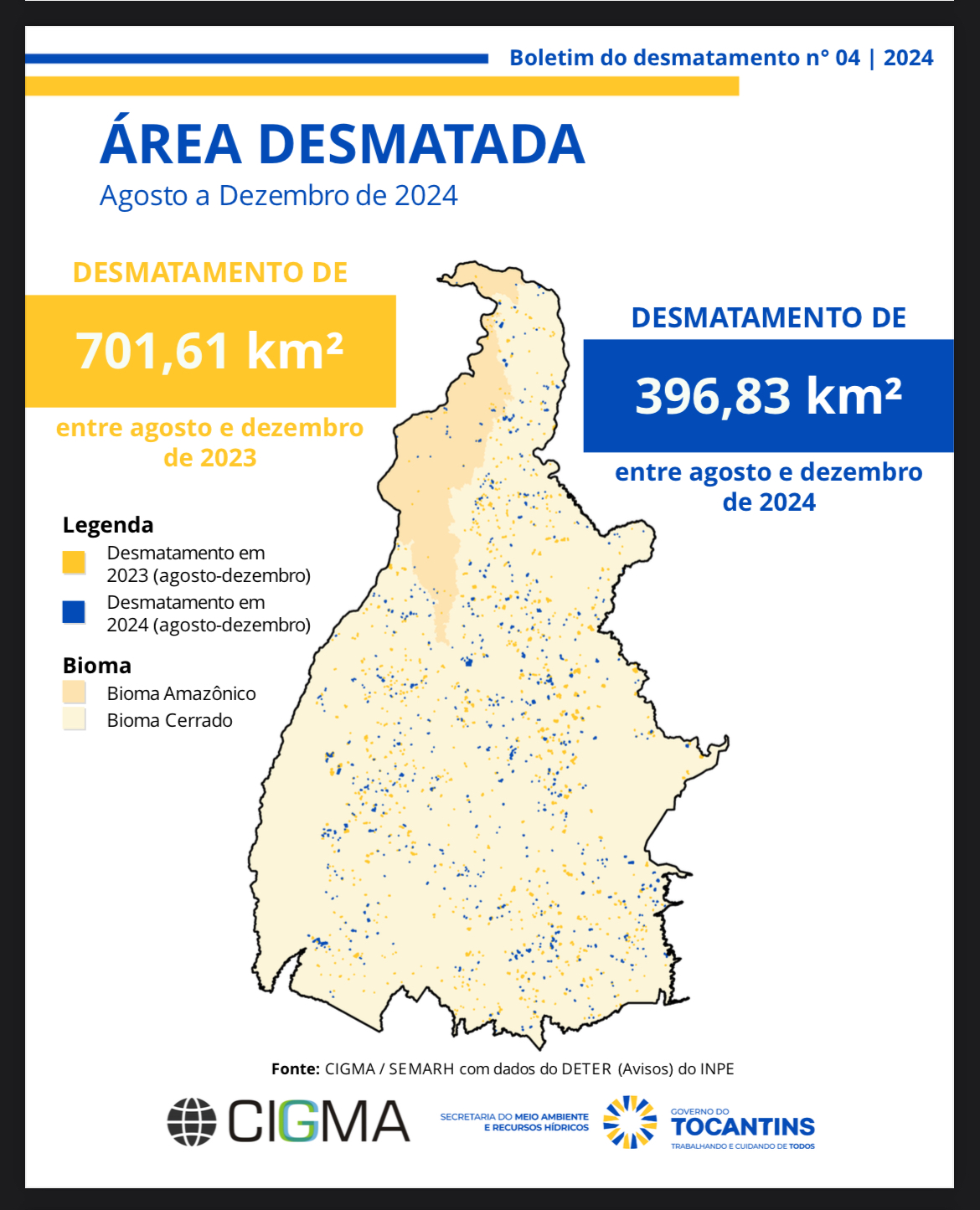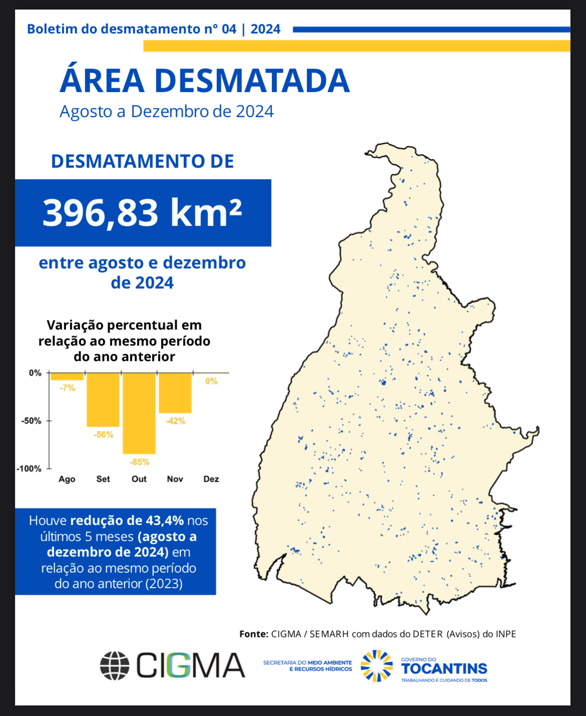 O Tocantins tem alcançado, mais uma vez, uma significativa redução do desmatamento em seu território, tanto no Bioma Amazônico quanto no Cerrado. De acordo com um levantamento realizado pelo Centro de Inteligência Geográfica em Gestão do Meio Ambiente (CIGMA), com base nos registros do sistema de alerta Deter/Inpe – Instituto Nacional de Pesquisas Espaciais, verificou-se uma redução de 43,4% nos últimos cinco meses, de agosto a dezembro de 2024, em comparação ao mesmo período do ano anterior, 2023, considerando tanto o desmatamento legal quanto o ilegal.
