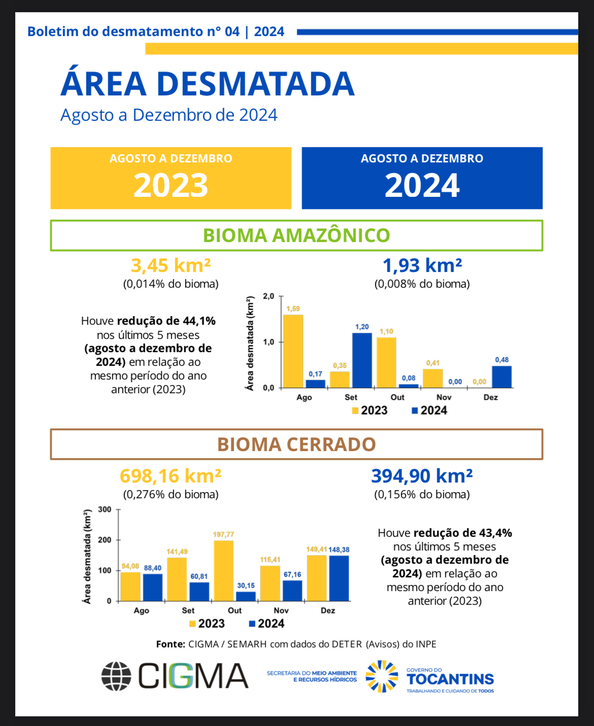 “Os resultados apresentados demonstram que as políticas públicas adotadas pelo governo do Tocantins estão no caminho certo para combater o desmatamento. A redução expressiva registrada tanto nos dois biomas é reflexo de um trabalho integrado entre o poder público, as comunidades locais e o setor produtivo. Continuaremos investindo em tecnologia, monitoramento e conscientização ambiental para garantir que esse progresso se mantenha e avancemos ainda mais na preservação dos nossos recursos naturais”, comemora o secretário do Meio Ambiente e Recursos Hídricos, Marcello Lelis.