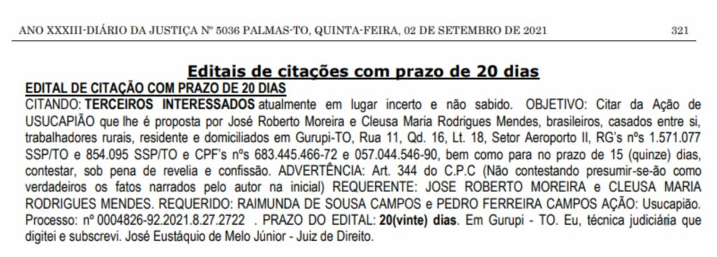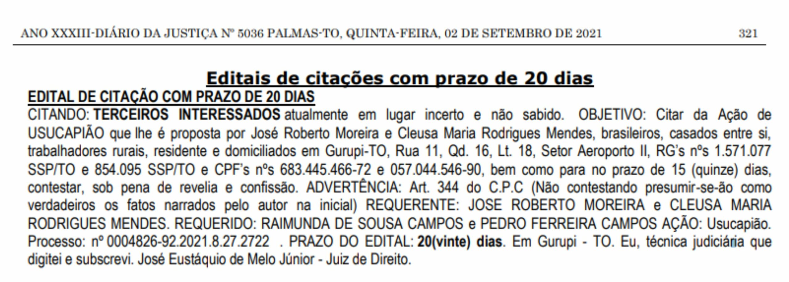 Lar»Cidades»Edital de citação prazo de 20 dias com objetivo de citar Ação de Usucapião