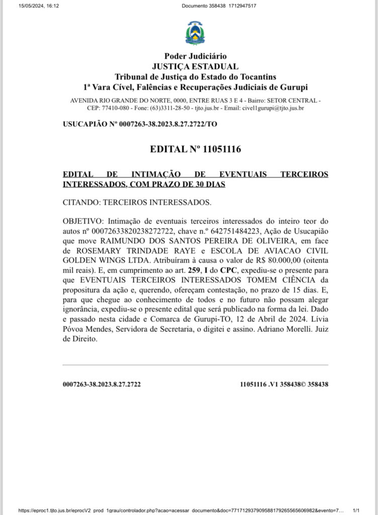 CITANDO: TERCEIROS INTERESSADOS. OBJETIVO: Intimação de eventuais terceiros interessados do inteiro teor do autos nº 00072633820238272722, chave n. º 642751484223, Ação de Usucapião que move RAIMUNDO DOS SANTOS PEREIRA DE OLIVEIRA, em face de ROSEMARY TRINDADE RAYE e ESCOLA DE A VIACAO CIVIL GOLDEN WINGS LTDA.