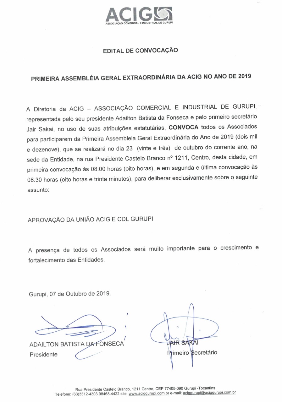 Em defesa do interesse da classe empresarial, a ACIG irá promover a Primeira Assembleia Geral do ano para deliberar sobre a aprovação da união com a ACIG. Conforme o Edital de Convocação [leia abaixo], a Assembleia irá acontecer às 08h  do dia 23 de outubro na sede da entidade, localizada na Rua Presidente Castelo Branco, nº 1211, Centro de Gurupi.