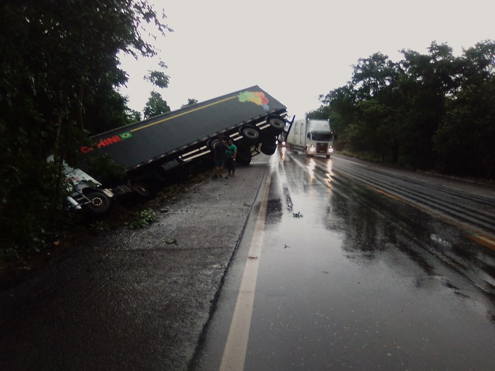 O motorista perdeu o controle e saiu pra fora da BR-153, apesar do susto ele saiu sem nenhum ferimento. Ainda segundo a defesa civil, o local pode ser interditado para remoção do caminhão.