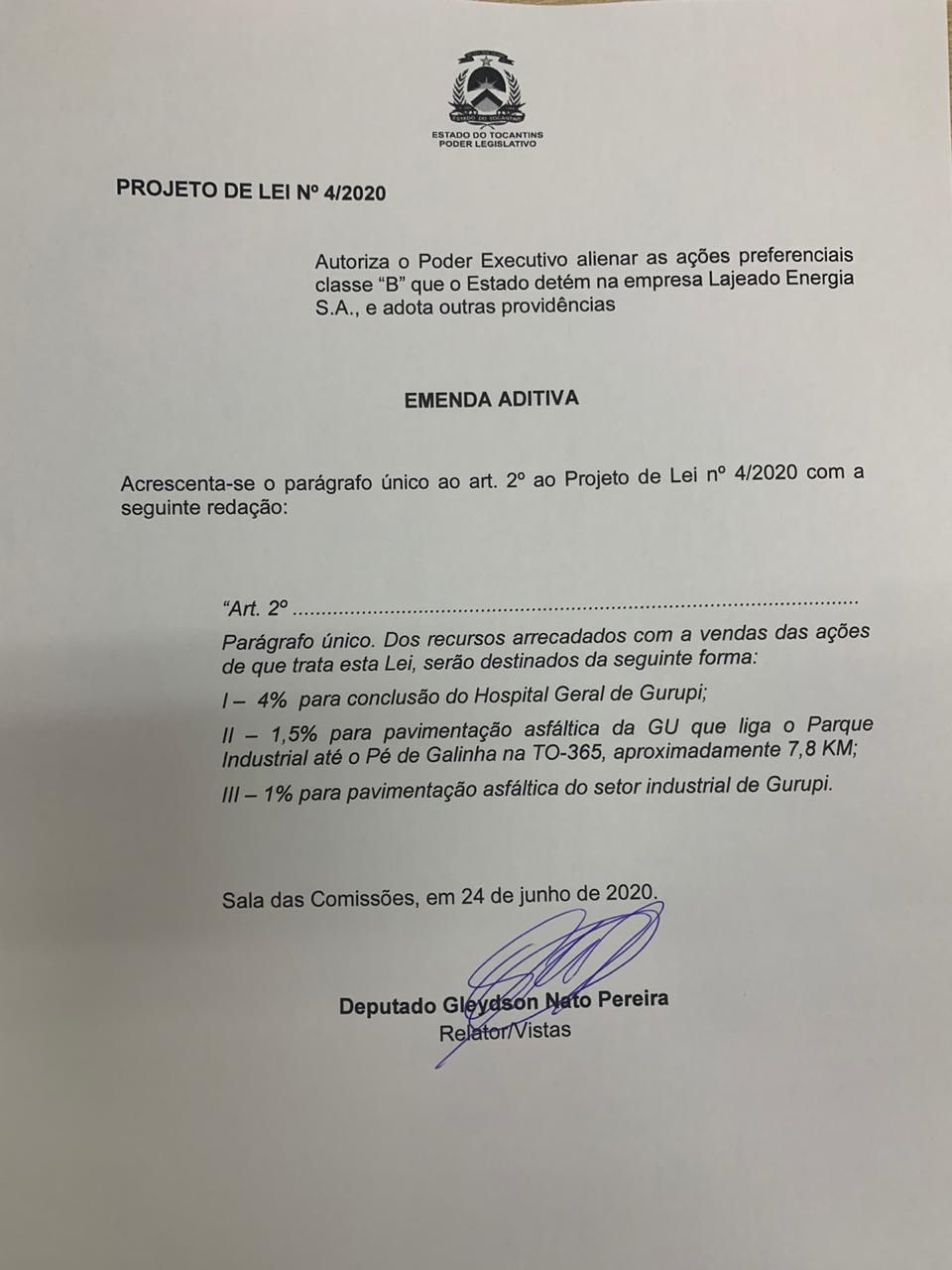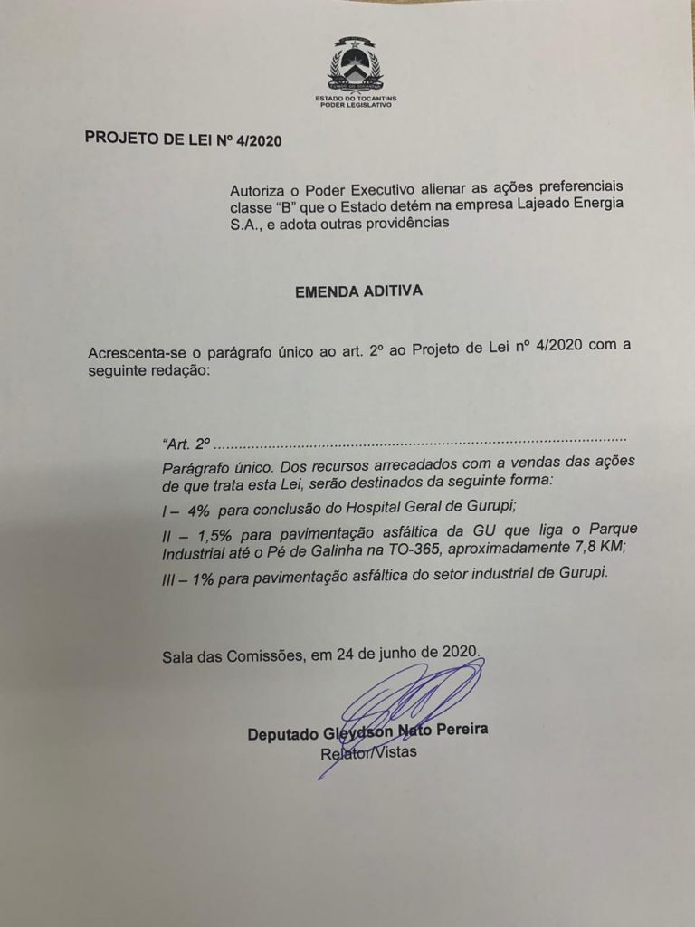 Com a emenda de autoria do deputado Gleydson Nato, 4% das vendas das ações serão designadas para a conclusão do Hospital Geral de Gurupi (HGG), 1,5% para a pavimentação asfáltica da GU que liga o Parque Industrial até o Pé de Galinha na TO- 365 (aproximadamente 7,8km) e 1% para a pavimentação asfáltica do Setor Industrial de Gurupi.