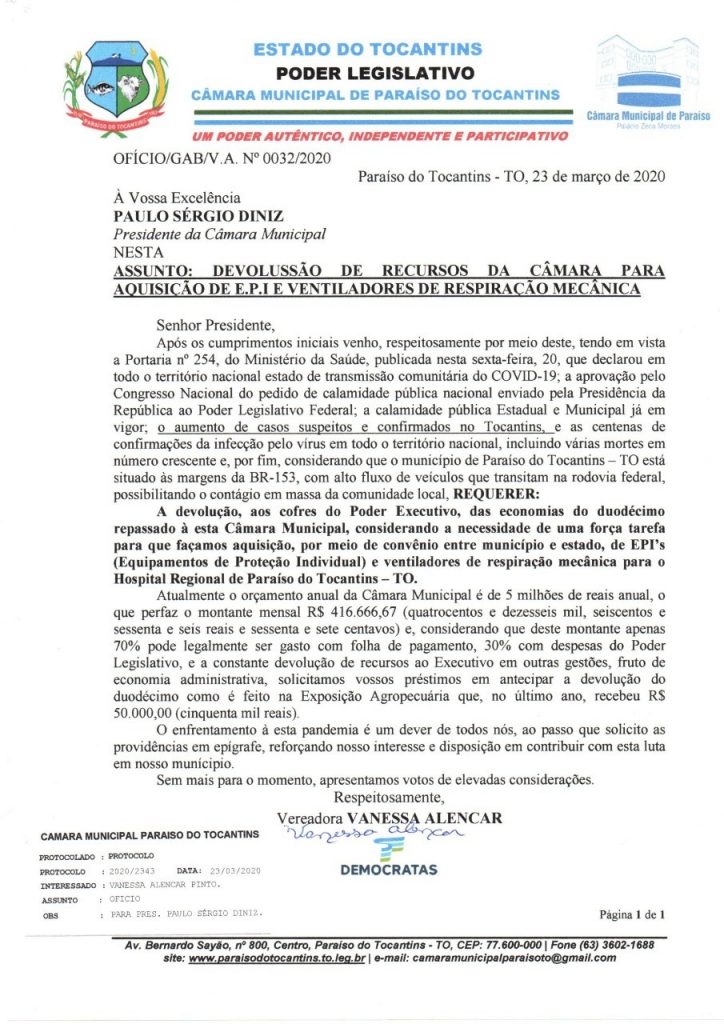 A Vereadora Vanessa Alencar de Paraíso do Tocantins – TO, por meio do Ofício nº 0010 protocolizado nesta segunda-feira (23) junto a Mesa Diretora da Câmara Municipal de Paraíso do Tocantins – TO, sugeriu a devolução, aos cofres do Poder Executivo, das economias do duodécimo repassado à esta Câmara Municipal, considerando a necessidade de uma força tarefa para que façamos aquisição, por meio de convênio entre município e estado, de EPI’s (Equipamentos de Proteção Individual) e ventiladores de respiração mecânica para o Hospital Regional de Paraíso do Tocantins – TO.