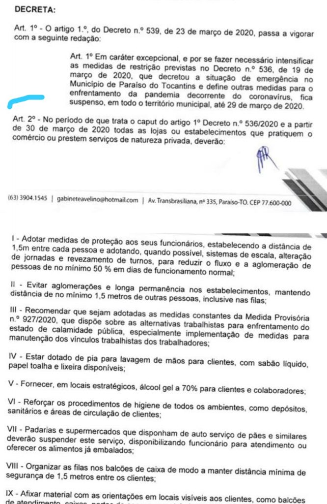 Através de novo decreto nº 540/2020, publicado nesta quinta-feira, 26, a prefeitura de Paraíso do Tocantins liberou o funcionamento do comercio local a partir da próxima segunda-feira, 30, com restrições para estabelecimentos como clubes academias, casas de shows, além da unidades educacionais.