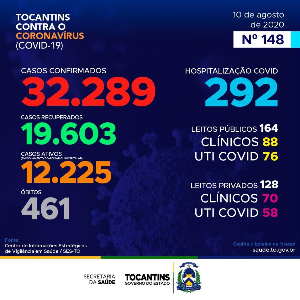 Atualmente, o Tocantins apresenta 32.289 casos no total, destes, 19.603 pacientes estão recuperados, 12.225 pacientes estão ainda em isolamento domiciliar ou hospitalar e 461 pacientes foram a óbito.