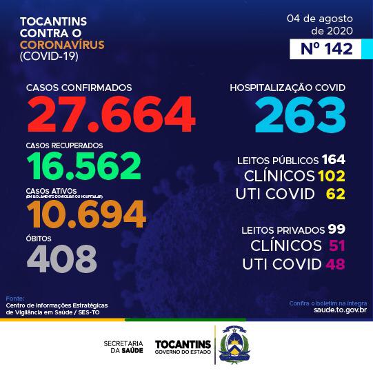 Atualmente, o Tocantins apresenta 27.664 casos no total, destes, 16.562 pacientes estão recuperados, 10.694 pacientes estão ainda em isolamento domiciliar ou hospitalar e 408 pacientes foram a óbito.