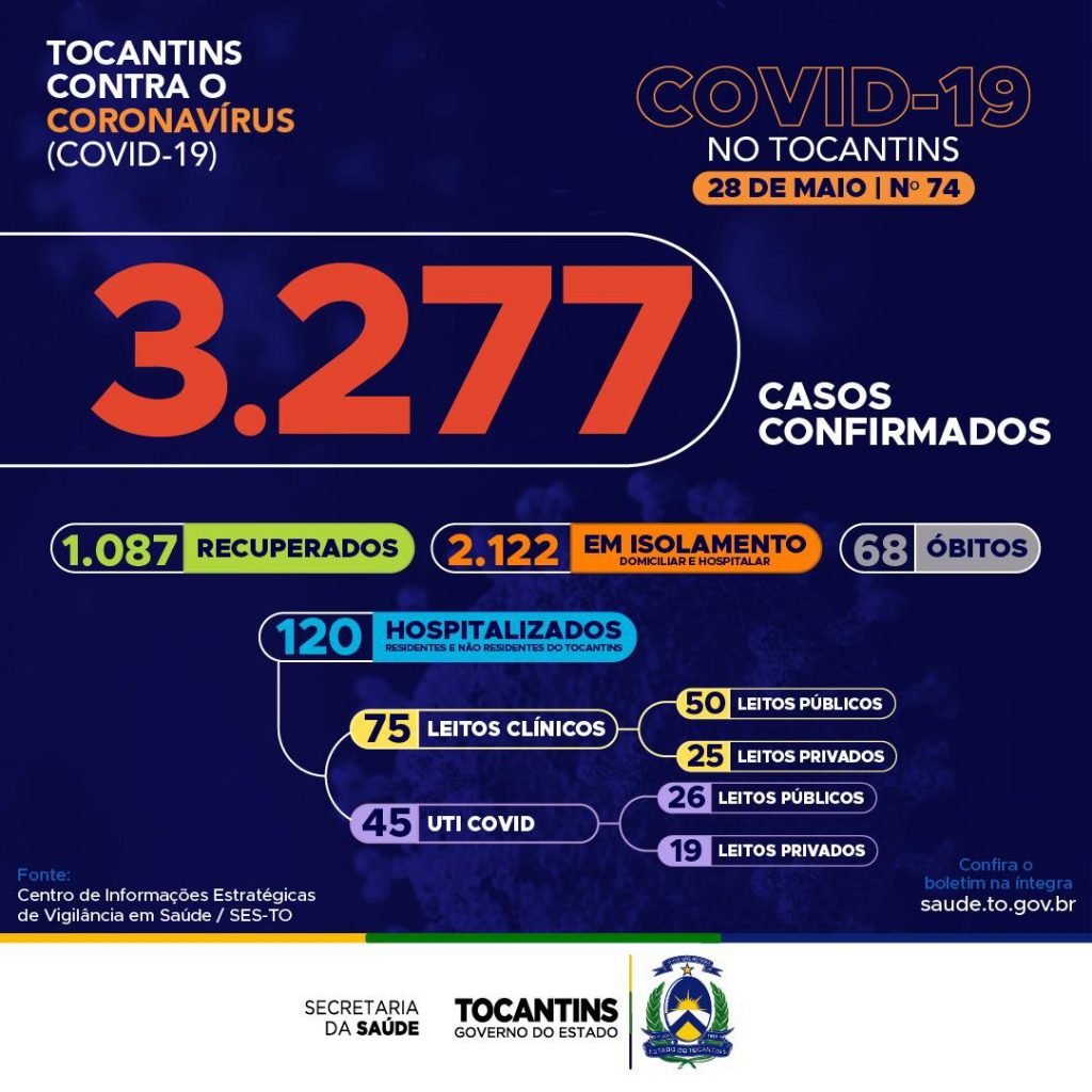 Atualmente, o Tocantins apresenta 3.277 casos no total, destes, 1.087 pacientes estão recuperados, 2.122 pacientes estão ainda em isolamento domiciliar ou hospitalar e 68 pacientes foram a óbito.