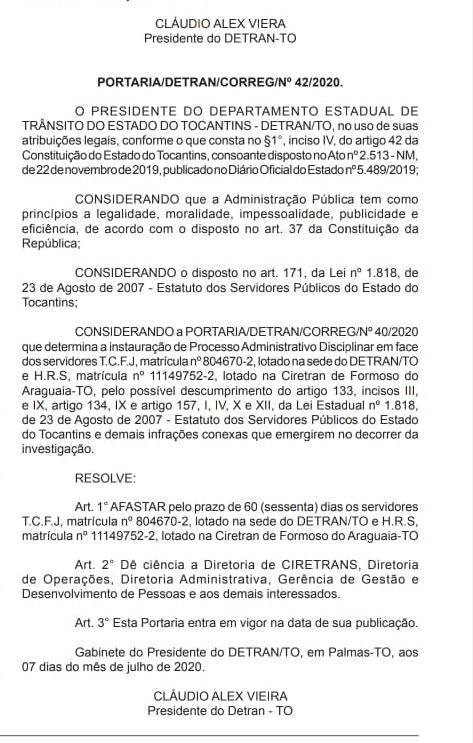 A portaria publicada informa que o vereador e mais um servidor do Detran de Palmas foram afastados pelos prazos de 60 dias do órgão. Na oportunidade foi instaurado um processo administrativo disciplinar por vários descumprimentos com os cargos que ocupam. O motivo do afastamento e da investigação não foram anunciados.