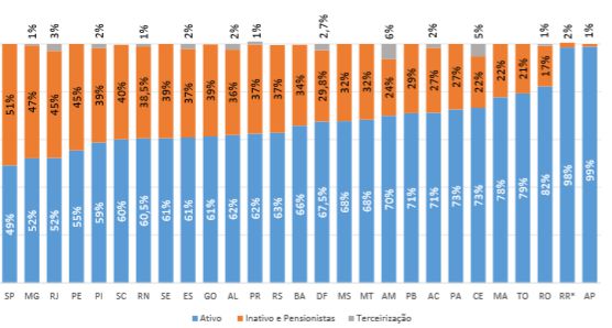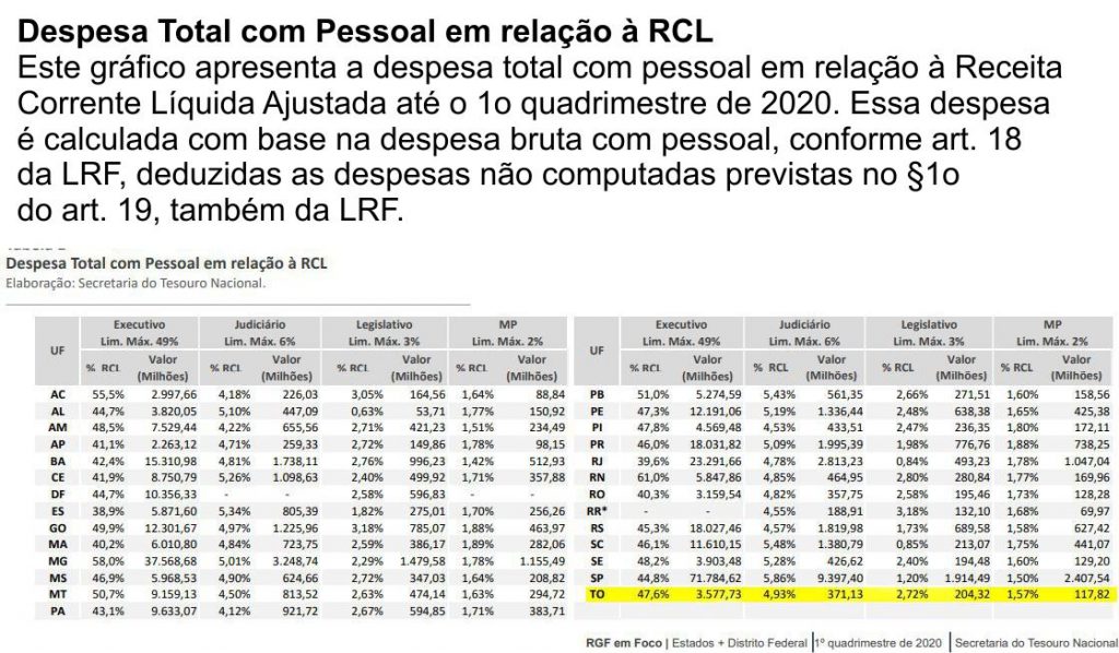 O Relatório de Gestão Fiscal (RGF) mostra as despesa total com pessoal em relação à Receita Corrente Líquida Ajustada até o 1º quadrimestre de 2020. Nele aparece quatro estados (AC, MG, PB e RN) gastaram mais de 60% da receita líquida com pessoal. O Executivo do Tocantins aparece na 18ª posição, comprometendo 47,6% de sua receita líquida com servidores, abaixo dos 49% do índice da Lei de Responsabilidade.