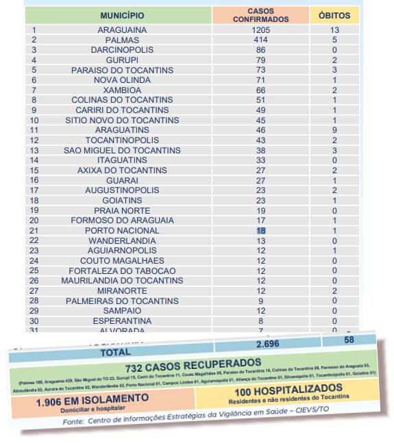 Segundo o Boletim Epidemiológico da Secretaria Estadual de Saúde, o Tocantins totalizou nesta segunda-feira, 25, 2.696 casos, destes, 732 pacientes estão recuperados, 1.906 pacientes estão ainda em isolamento domiciliar ou hospitalar e 58 pacientes foram a óbito. A pandemia chegou em 81, dos 139 municípios do Tocantins.