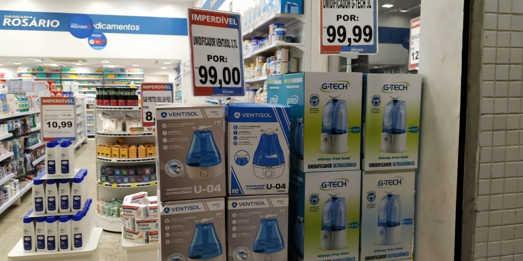 Aproveitando o nicho do calor e da pouca umidade no ar que chegou a 12%, comerciantes buscam atrair o consumidor com promoções em ar condicionado, climatizador evaporativo de ambiente e do queridinho e barato umidificador de ar.