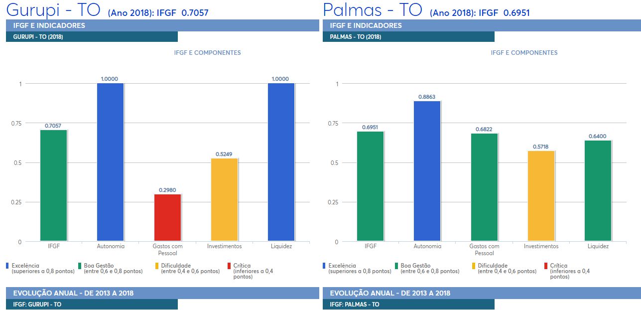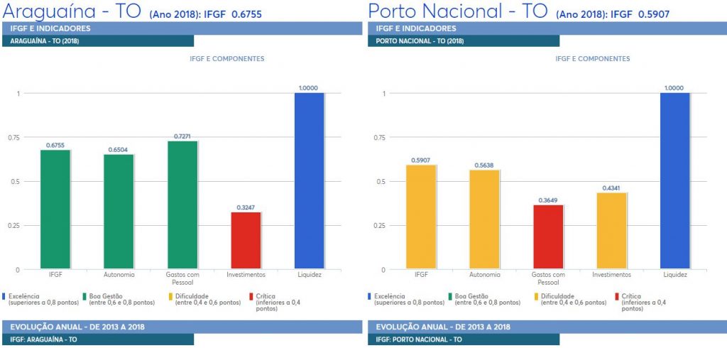 O IFGF faz referência a 2018 e avalia as contas de 5.337 municípios de todo o país, que concentram 97,8% da população brasileira. Dos 139 municípios do Tocantins, foram avaliados 126 (Confira como ficou o ranking do Tocantins). Construído com base em dados fiscais oficiais, declarados pelas próprias prefeituras, o índice é composto por quatro indicadores: IFGF Autonomia, IFGF Gastos com Pessoal, IFGF Liquidez e IFGF Investimentos.